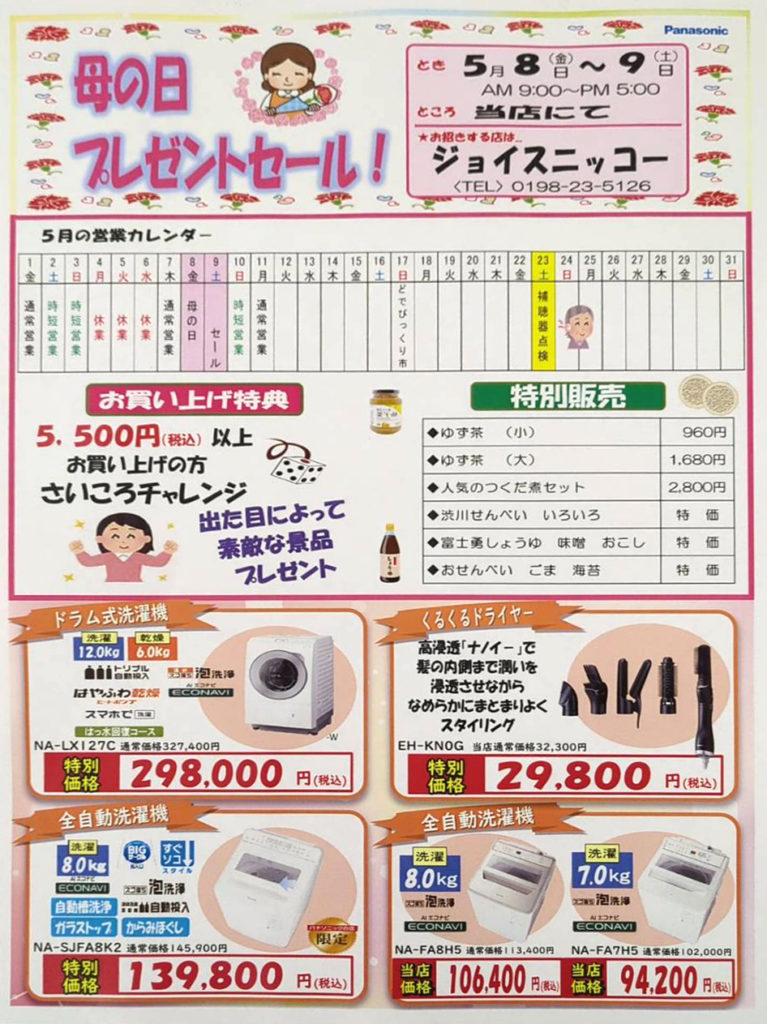 母の日セール&ゴールデンウィークのお知らせ